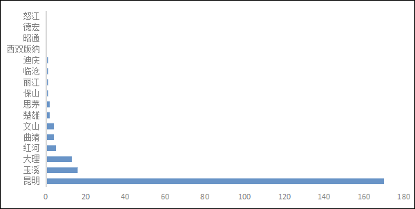 云南省下轄8個地級市、8個自治州,合計16個地級行政區(qū)劃單元,省會昆明市。本次調(diào)查的云南省環(huán)保企業(yè)數(shù)量的地區(qū)分布如圖6。