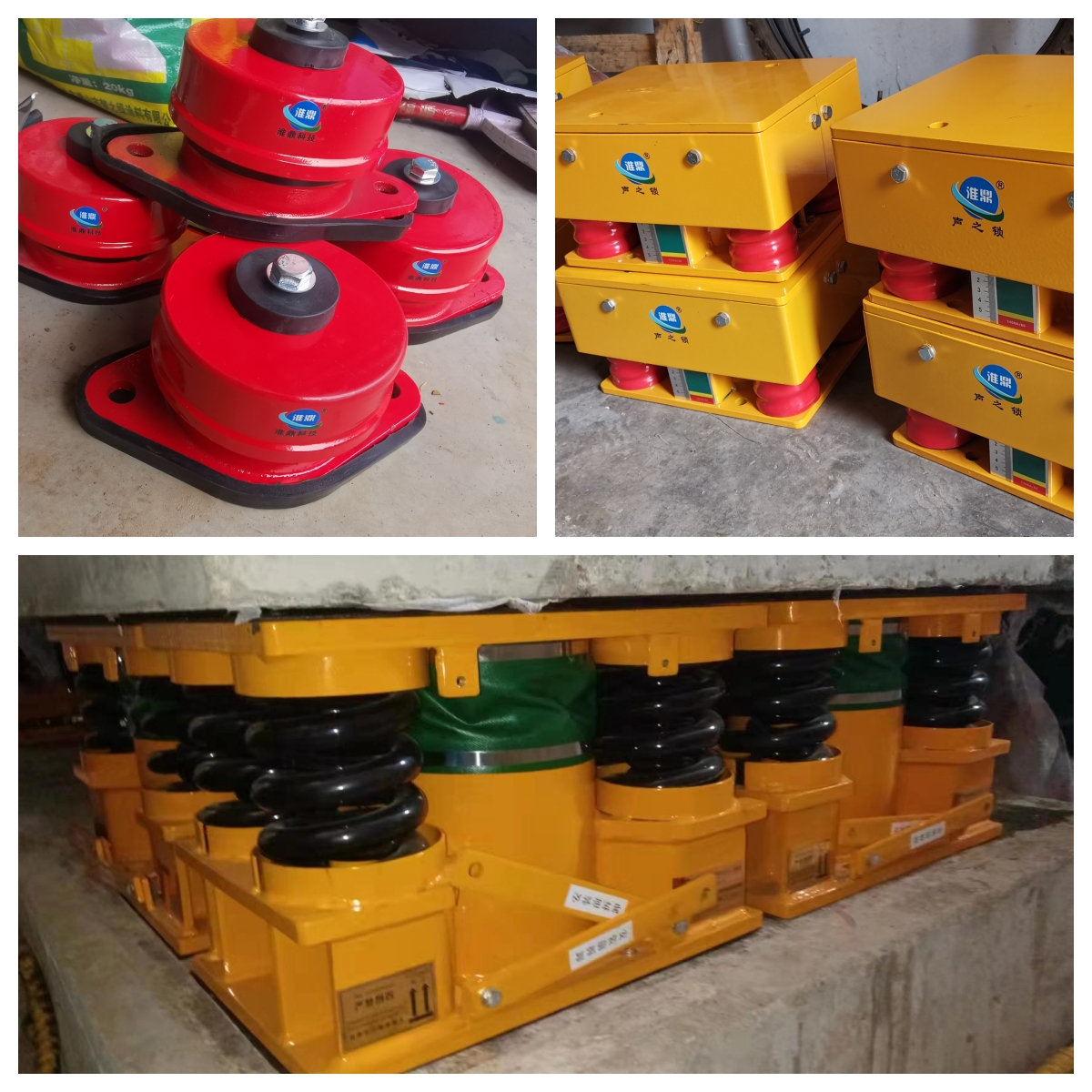 隔振器:頻率低于 6Hz的低頻靜音減振器??蛇x大撓度(不低于 50mm)低頻彈簧減振器配合天然膠墊安裝或者加裝空氣彈簧減振器。因是改造項(xiàng)目,彈簧減振器高度過(guò)大,不適合安裝,所以設(shè)計(jì)安裝超低頻靜音系列的空氣彈簧減振器、橡膠減震器、部分鋼彈簧減震器等其他減振產(chǎn)品配合使用。隔振降噪原理:空氣是振動(dòng)和噪音的不良導(dǎo)體,用隔振手段把設(shè)備與樓板隔離開(kāi),由剛性連接轉(zhuǎn)換成軟性連接,中斷振動(dòng)傳播途徑。 設(shè)計(jì)隔振效率:90%。 隔振效果:安裝后整個(gè)隔振體系的自振頻率達(dá)到 3Hz以下,低頻振動(dòng)及因低頻振動(dòng)產(chǎn)生的噪音基本消除。